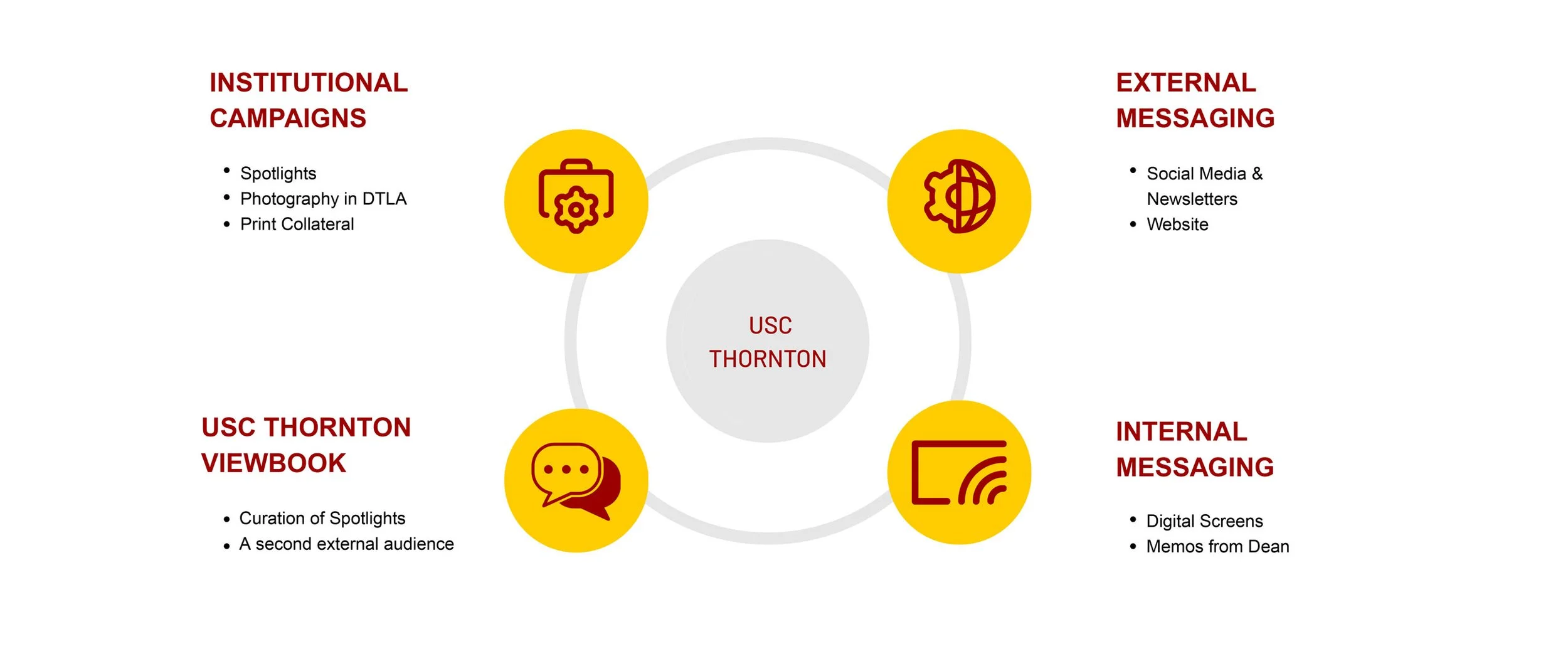 The deck highlighting the work of USC Thornton Communications was produced by the communications staff. USC Thornton’s institutional and sizzle videos were produced in partnership with Midnight Hour Productions.