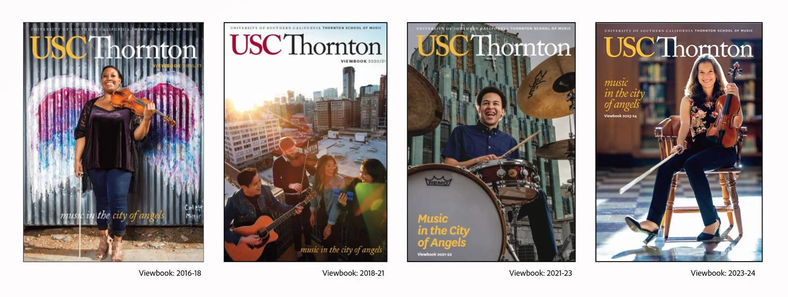 The relaunch of the Thornton Viewbook also included a visual branding campaign. Rather than performance photos in concert and rehearsal halls, Calbi took students into Downtown Los Angeles for curated photo shoots that featured them in the city. Under the slogan, “Music in the City of Angeles,” this image campaign, along with the curation of Spotlights, emphasized the opportunities and connections made possible by the school’s central location in one of the world’s great hubs of music.